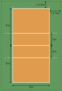 A área de jogo compreende a quadra de jogo e a zona livre. Ela deve ser retangular e simétrica medindo 18m x 9m, circundada por uma zona livre com, no mínimo, 3m de largura. O espaço livre de jogo é todo o espaço situado acima da área de jogo, livre de qualquer obstáculo, devendo medir, no mínimo, 7m de altura, a partir do solo. Nas competições mundiais da FIVB, a zona livre deve ser de, no mínimo, 5m a partir das linhas laterais e de 8m a partir das linhas de fundo. O espaço livre de qualquer obstáculo, medido da superfície da quadra, deve ser de, pelo menos, 12,5m de altura. Nos Campeonatos Mundiais Adulto e Jogos Olímpicos a zona livre deverá medir no mínimo 6m, a partir das linhas laterais e 9m a partir das linhas de fundo.